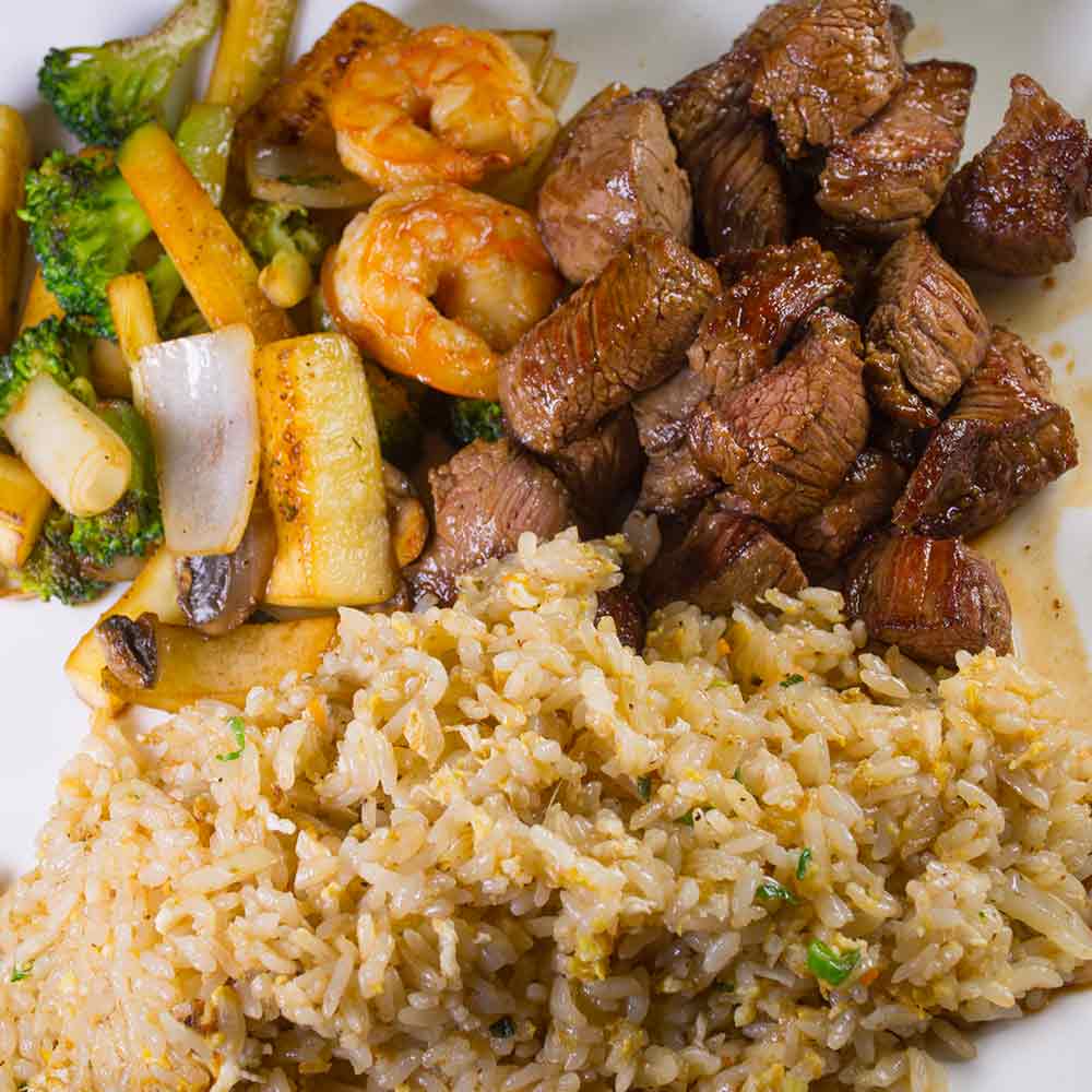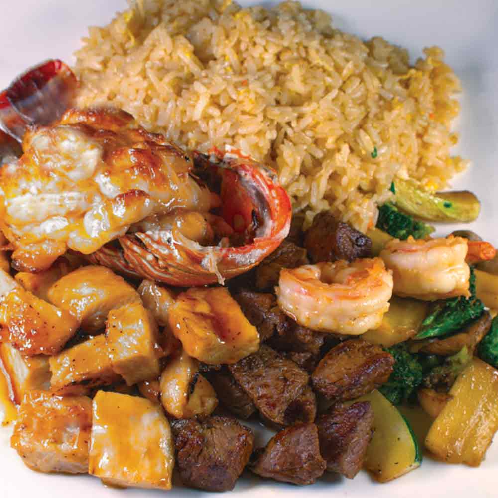 Choosing a meat or seafood or chicken or vegetable entree and it also includes hibachi fried rice or noodles. You can sit at a hibachi table or dine in at a regular table to order, we also offer hibachi for take out or hibachi platters to go.