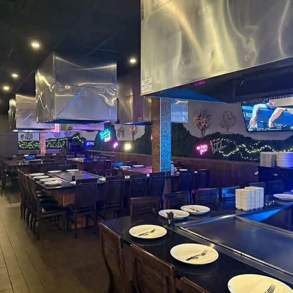 Teppanyaki flat grill style cooking for a group [8-10] per section [many group together at several sections or share a section as a great family friendly community interaction.