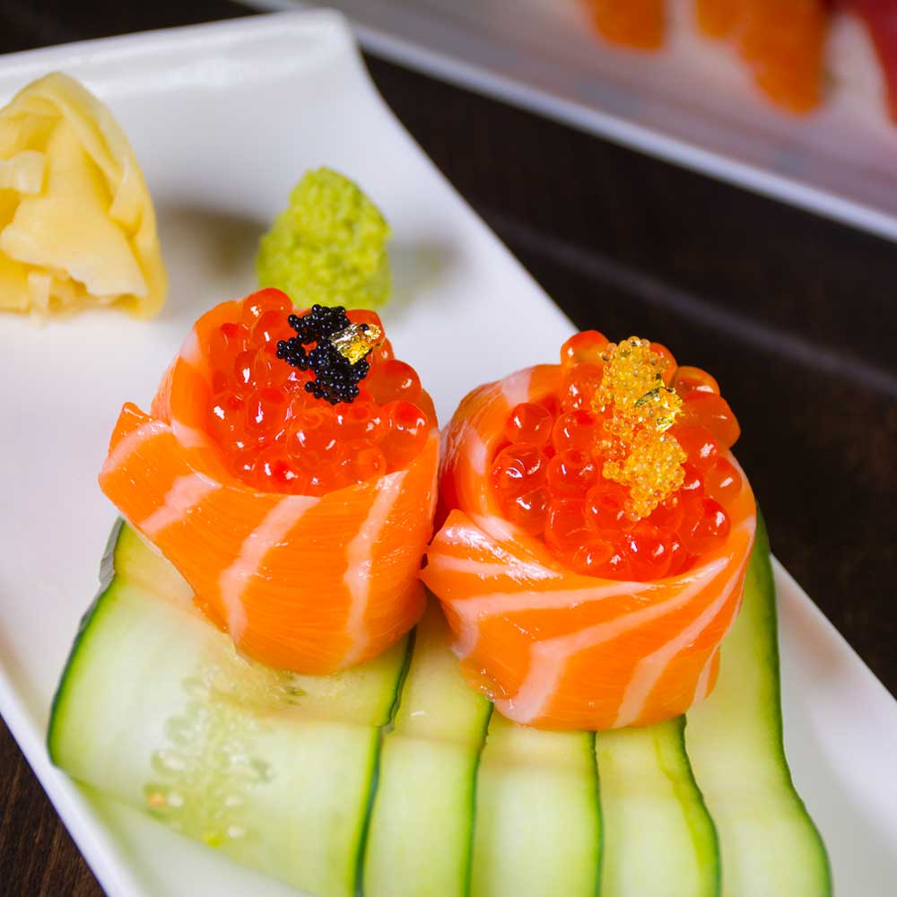 Fresh Scottish Salmon wrapped around rice & Salmon Roe topped